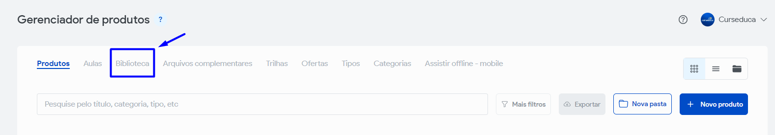 Acesse seu ambiente como instrutor ou administrador e clique em 'Produtos'
