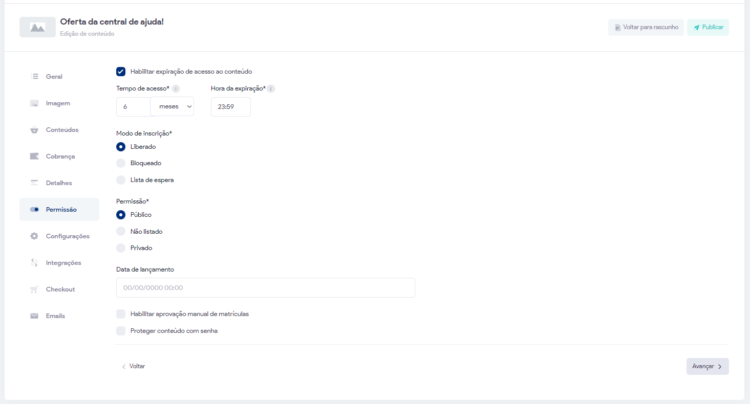 Nesta seção você deve configurar como será a entrega do seu conteúdo, se vitalícia ou temporária. Quando a entrega for temporária, você deve escolher por quanto tempo os alunos terão acesso ao conteúdo, em dias ou meses. Fique a vontade para escolher o período que melhor funciona para você. Para selecionar Vitalicia desmarque a caixinha de seleção.