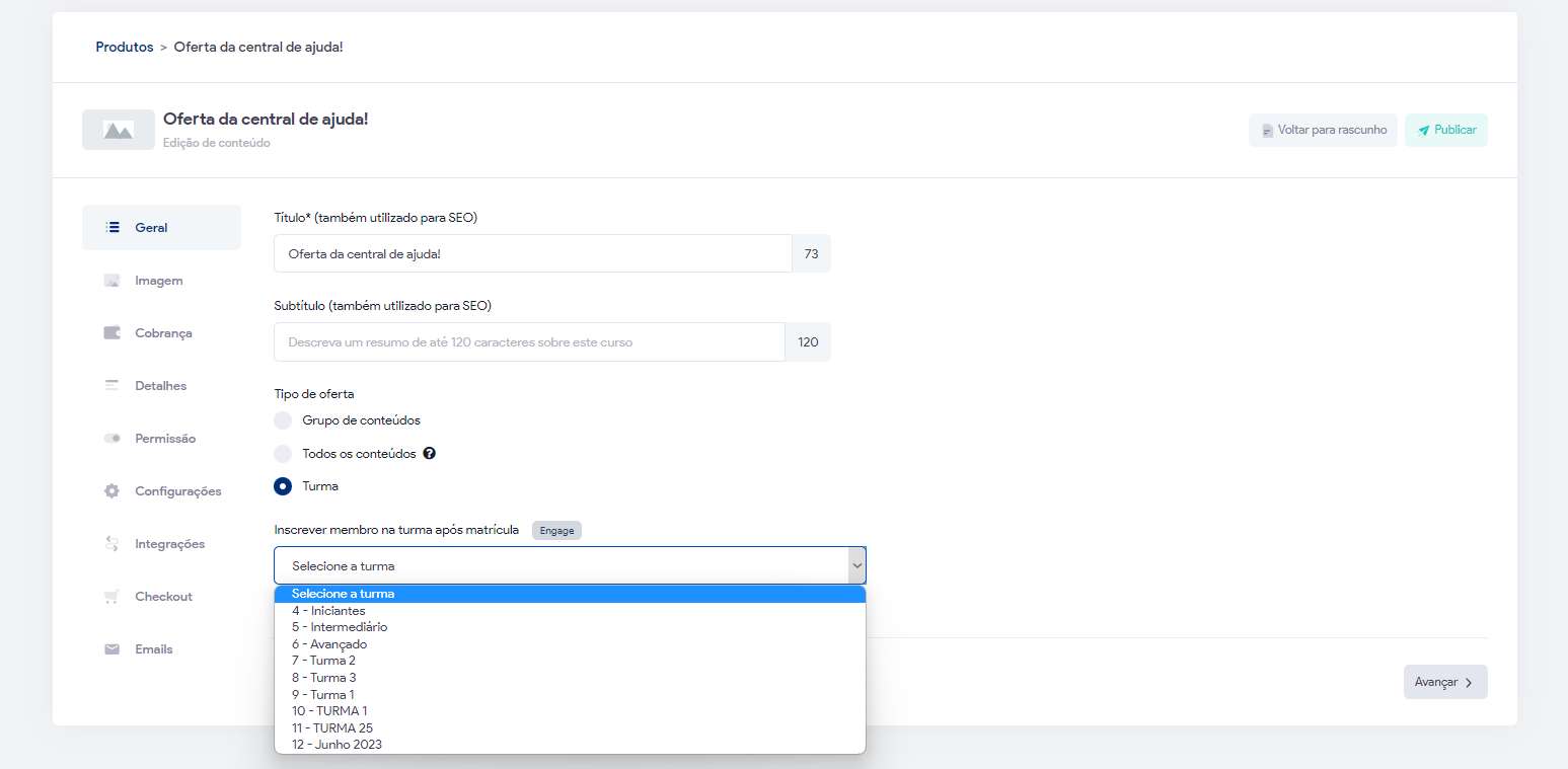 Ao selecionar essa opção e selecionar a turma, quando o aluno efetuar a compra ele será matriculado na turma que você selecionou.