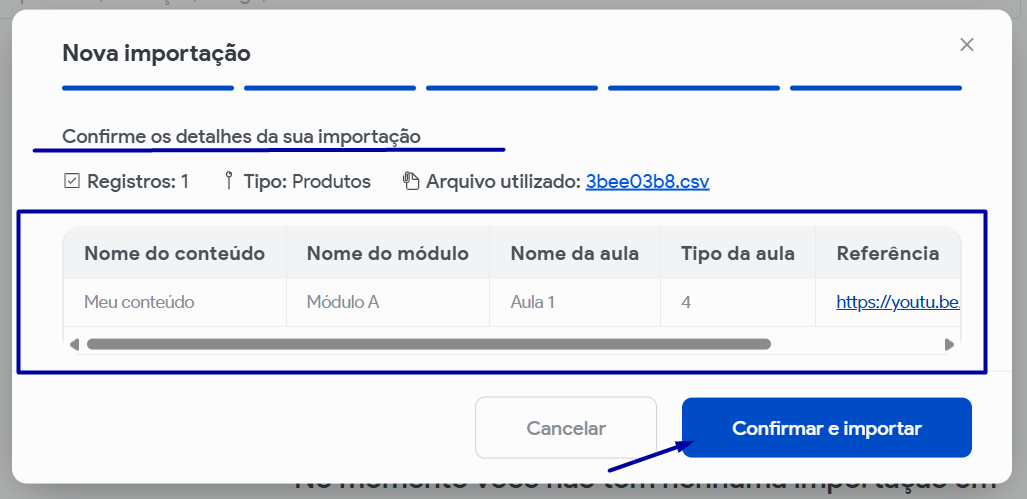 8. Por fim aparecerá todas as linhas do seu arquivo, após ‘**Continuar e Importar**’ o processo começará a ser feito.