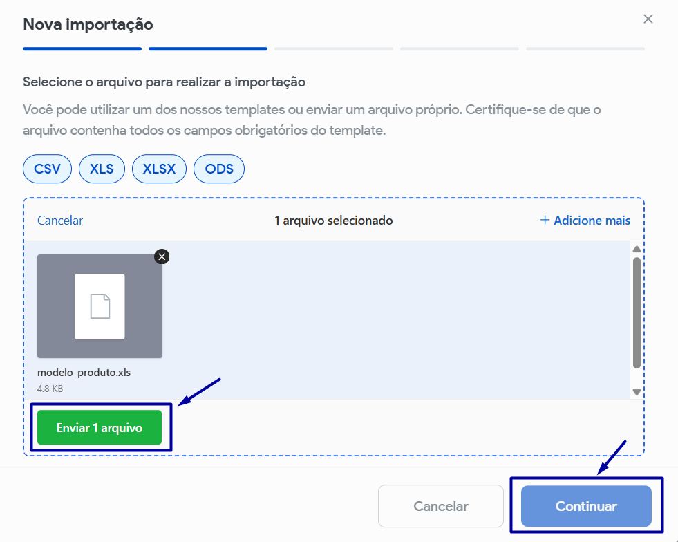 5. Após preencher a planilha, você deve salvar em ' CSV, XLSX, XLS ou ODS' e colar no espaço, conforme mostra na imagem. Em seguida, você irá **'enviar o arquivo'** e **'continuar'**