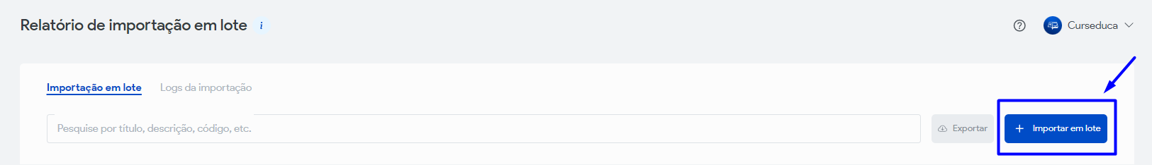 <figure><img src="https://2164836145-files.gitbook.io/~/files/v0/b/gitbook-x-prod.appspot.com/o/spaces%2F-LtoLBvE-NBxibKO0U39%2Fuploads%2FHs01wgQgUjB6Xci9zDqA%2Fimage.png?alt=media&#x26;token=cfcf8893-ad49-4136-99b0-cc5ba3633c7c" alt=""><figcaption><p>Configurações > Importação > Importar em Lote</p></figcaption></figure>