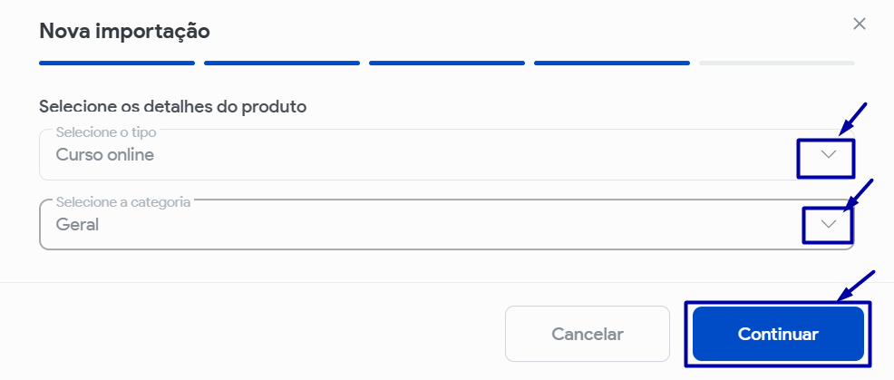 3. Selecione a importação que você deseja. Neste caso, vamos escolher **'produtos'** e, em seguida clique em continuar. Conforme a imagem:&#x20;