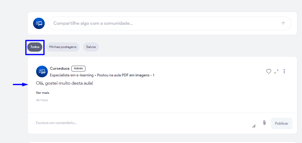 Lembrando que, quando habilitado os comentários, eles também irão aparecer no "feed" da comunidade. Pois, aquele espaço centraliza todos os comentários com o intuito de que o administrador consiga ver tudo que foi postado em todos os lugares da plataforma.