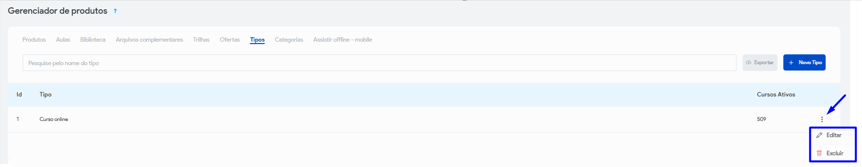 Uma visão organizada dos formatos de conteúdo disponíveis em sua plataforma, permitindo que você gerencie categorias como vídeos, quizzes, arquivos, textos e outros.