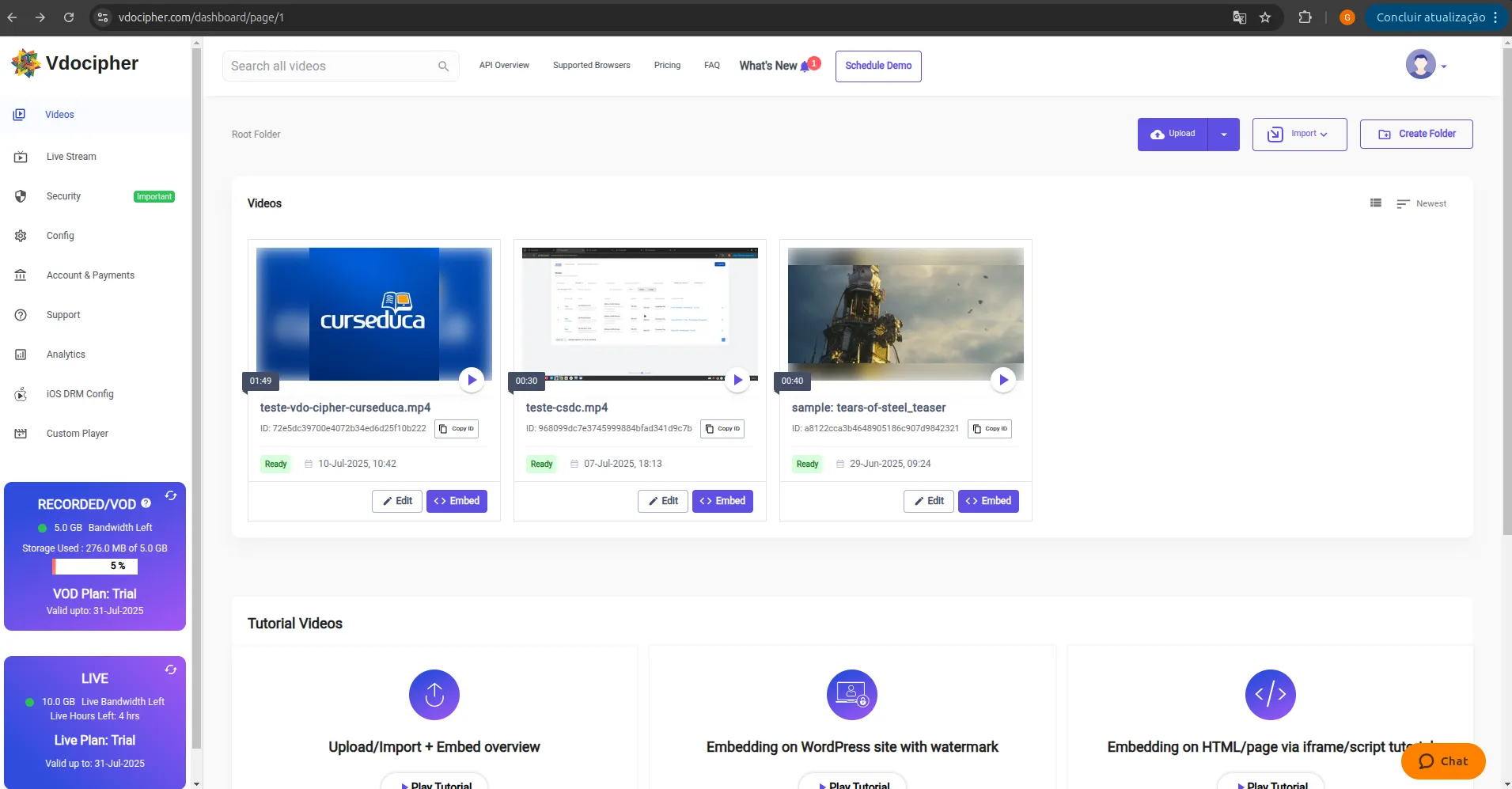 * Também é possível usar vídeos de exemplo que já vêm na conta de teste.