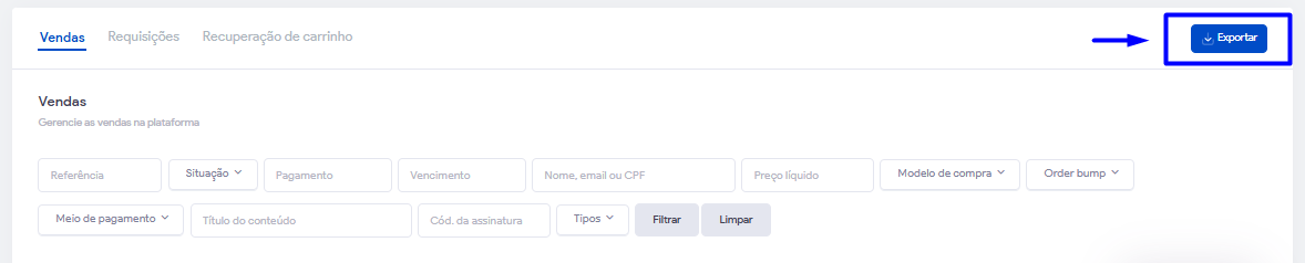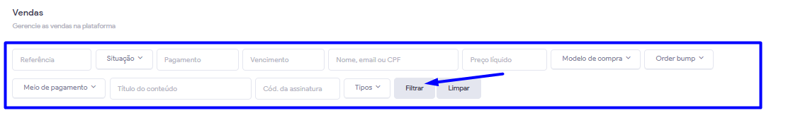 Há diversas formas de filtragem dos relatórios, e os filtros permitem múltiplas seleções. Você consegue pesquisar por membros, pela situação da compra, pelo meio de pagamento e muito mais. Basta escolher as opções necessárias e clicar em 'filtrar'
