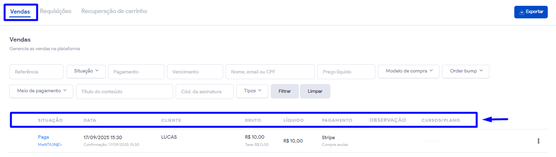 No relatório de vendas é possível visualizar todas as transações realizadas na plataforma. Para acessar basta ir no menu a esquerda e selecionar a opção "Vendas e Financeiro"